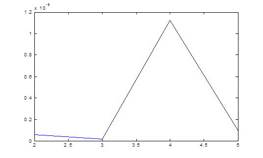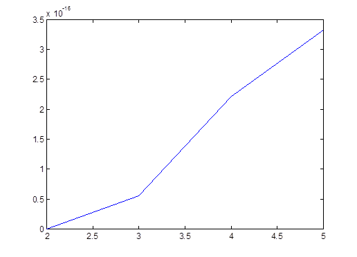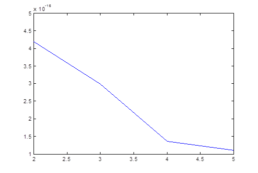 Как видим из решения и графиков, величина ошибок уменьшается, а точность найденного решения увеличивается с увеличением количества нулевых элементов в матрице А. Это связано с тем, что увеличение числа нулевых элементов постепенно уменьшает число ненулевых элементов задействованных в вычислениях. Теперь исследуем влияние обусловленности матрицы А на точность получаемого решения. Для этого в третий раз модифицируем нашу программу. Теперь мы будем брать обусловленные матрицы, с каждым шагом увеличивая их размерность. Текст программы: e1=0; e2=0; a=[500 501;501 500] f=[15000;16000] [e,x]=mkk(a,f) e1=max(abs(e)) e2=sqrt(sum(power(e,2))) a=[500 501 -503;501 500 499;-503 499 500] f=[15000;16000;18000] [e,x]=mkk(a,f) e1=[e1 max(abs(e))] e2=[e2 sqrt(sum(power(e,2)))] a=[500 501 -503 500;501 500 499 -501;-503 499 500 502;500 -501 502 500] f=[15000;16000;18000;16000] [e,x]=mkk(a,f) e1=[e1 max(abs(e))] e2=[e2 sqrt(sum(power(e,2)))] a=[500 501 -503 500 499;501 500 499 -501 500;-503 499 500 502 -501;500 -501 502 500 -500; 499 500 -501 -500 500] f=[15000;16000;18000;16000;17000] [e,x]=mkk(a,f) e1=[e1 max(abs(e))] e2=[e2 sqrt(sum(power(e,2)))] mernost=[2 3 4 5]; plot(mernost,e1); pause; plot(mernost,e2); pause Результат работы программы: >> head5 a = 500 501 501 500 f = 15000 16000 e = 1.0e-010 * -0.2910 0.5821 x = 515.4845 -484.5155 e1 = 5.8208e-011 e2 = 6.5078e-011 a = 500 501 -503 501 500 499 -503 499 500 f = 15000 16000 18000 e = 1.0e-010 * 0.0182 0.0364 0.1455 x = -2.0239 32.9970 1.0330 e1 = 1.0e-010 * 0.5821 0.1455 e2 = 1.0e-010 * 0.6508 0.1511 a = 500 501 -503 500 501 500 499 -501 -503 499 500 502 500 -501 502 500 f = 15000 16000 18000 16000 e = 1.0e-008 * 0 0 -0.1120 0.0997 x = 14.5050 16.5505 17.4961 16.5125 e1 = 1.0e-008 * 0.0058 0.0015 0.1120 e2 = 1.0e-008 * 0.0065 0.0015 0.1500 a = 500 501 -503 500 499 501 500 499 -501 500 -503 499 500 502 -501 500 -501 502 500 -500 499 500 -501 -500 500 f = 15000 16000 18000 16000 17000 e = 1.0e-010 * -0.0364 0.0364 0.8367 -0.9459 0.1091 x = 33.0693 35.1332 -1.0682 -2.1077 -37.3144 e1 = 1.0e-008 * 0.0058 0.0015 0.1120 0.0095 e2 = 1.0e-008 * 0.0065 0.0015 0.1500 0.0127 ДляE1 =max |Ei |,