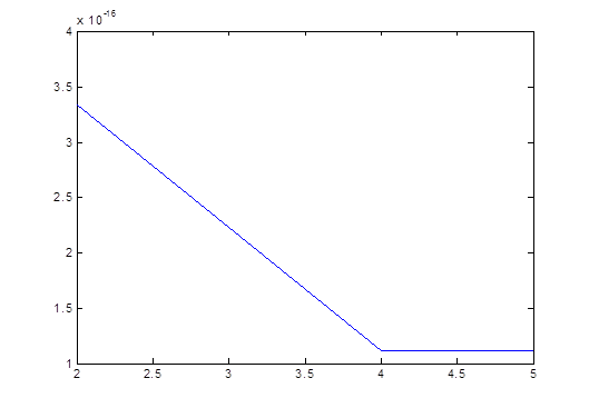 Как видим из решения, выданного программой, а также из графиков, ошибка растет с увеличением мерности матрицы А, а точность решения, как следствие уменьшается. Теперь исследуем влияние разреженности матрицы А на точность решения. Для этого немного модифицируем программу, использованную для исследования влияния мерности матрицы А на точность решения: изменим в ней СЛАУ для решения. На каждом шаге будем увеличивать количество нулевых элементов в матрице. Текст программы: e1=0; e2=0; a=[1 0.42 .54 .66 .53;.42 1 .32 .44 .45; .54 .32 1 .22 .41; .66 .44 .22 1 .25; .53 .45 .41 .25 1;] f=[0.3;0.5;.7;.9;.6] [e,x]=mkk(a,f) e1=max(abs(e)) e2=sqrt(sum(power(e,2))) a=[1 0 .54 0 .53;0 1 .32 .44 .45; .54 .32 1 .22 .41; 0 .44 .22 1 .25; .53 .45 .41 .25 1;] f=[0.3;0.5;.7;.9;.6] [e,x]=mkk(a,f) e1=[e1 max(abs(e))] e2=[e2 sqrt(sum(power(e,2)))] a=[1 0 .54 0 .53;0 1 .32 .44 .45; .54 .32 1 .22 .41; 0 .44 .22 1 0; .53 .45 .41 0 1;] f=[0.3;0.5;.7;.9;.6] [e,x]=mkk(a,f) e1=[e1 max(abs(e))] e2=[e2 sqrt(sum(power(e,2)))] a=[1 0 .54 0 0;0 1 0 .44 .45; .54 0 1 .22 0; 0 .44 .22 1 0; 0 .45 0 0 1;] f=[0.3;0.5;.7;.9;.6] [e,x]=mkk(a,f) e1=[e1 max(abs(e))] e2=[e2 sqrt(sum(power(e,2)))] mernost=[2 3 4 5]; plot(mernost,e1); pause; plot(mernost,e2); pause Результат работы программы: a = 1.0000 0.4200 0.5400 0.6600 0.5300 0.4200 1.0000 0.3200 0.4400 0.4500 0.5400 0.3200 1.0000 0.2200 0.4100 0.6600 0.4400 0.2200 1.0000 0.2500 0.5300 0.4500 0.4100 0.2500 1.0000 f = 0.3000 0.5000 0.7000 0.9000 0.6000 e = 1.0e-015 * 0.0555 0.2220 -0.1110 -0.3331 0 x = -1.6362 -0.1885 0.9761 1.6642 0.7358 e1 = 3.3307e-016 e2 = 4.1910e-016 a = 1.0000 0 0.5400 0 0.5300 0 1.0000 0.3200 0.4400 0.4500 0.5400 0.3200 1.0000 0.2200 0.4100 0 0.4400 0.2200 1.0000 0.2500 0.5300 0.4500 0.4100 0.2500 1.0000 f = 0.3000 0.5000 0.7000 0.9000 0.6000 e = 1.0e-015 * 0.0555 0.1110 0.2220 0.1110 0.1110 x = -0.1810 -0.1718 0.5355 0.7673 0.3618 e1 = 1.0e-015 * 0.3331 0.2220 e2 = 1.0e-015 * 0.4191 0.2989 a = 1.0000 0 0.5400 0 0.5300 0 1.0000 0.3200 0.4400 0.4500 0.5400 0.3200 1.0000 0.2200 0.4100 0 0.4400 0.2200 1.0000 0 0.5300 0.4500 0.4100 0 1.0000 f = 0.3000 0.5000 0.7000 0.9000 0.6000 e = 1.0e-015 * -0.0555 -0.0555 0 0.1110 0 x = -0.4156 -0.4724 0.5213 0.9932 0.8192 e1 = 1.0e-015 * 0.3331 0.2220 0.1110 e2 = 1.0e-015 * 0.4191 0.2989 0.1360 a = 1.0000 0 0.5400 0 0 0 1.0000 0 0.4400 0.4500 0.5400 0 1.0000 0.2200 0 0 0.4400 0.2200 1.0000 0 0 0.4500 0 0 1.0000 f = 0.3000 0.5000 0.7000 0.9000 0.6000 e = 1.0e-015 * 0 0 0 0 -0.1110 x = 0.0374 -0.1969 0.4863 0.8797 0.6886 e1 = 1.0e-015 * 0.3331 0.2220 0.1110 0.1110 e2 = 1.0e-015 * 0.4191 0.2989 0.1360 0.1110 ДляE1 =max |Ei |,