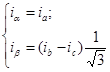 Рис. 8.2 Переход от трёхфазной системы координат к двухфазной и обратно выполняется с помощью формул преобразования координат. Переменные в новой системе координат находятся как сумма проекций в старой системе на оси новой системы координат.