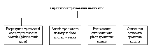 Рис. 1.3. Порядок складання платіжного календаря підприємства. Якщо планується позитивне сальдо, то можна розраховувати на отримання додаткового доходу. Якщо ж на стадії проекту виявлено нестачу фінансових коштів, то у керівника є час для прийняття необхідних заходів. Разом з тим, застосування наведеної методики має певні обмеження. Вона застосовується лише за умов, що кредити, отримані підприємством в поточному періоді, будуть витрачені тільки на надання товарного кредиту споживачам, а не на фінансування капітальних вкладень. В іншому випадку витрачання коштів на погашення кредиторської заборгованості минулих періодів призведе до зростання поточної заборгованості підприємства перед кредиторами. Особливо негативні результати така практика спричиняє в умовах інфляції, оскільки підприємство не може постійно фінансувати прострочені платежі за рахунок нових позик. Мінімально допустиме сальдо, встановлене емпіричним шляхом, дорівнює 5 % від сум щомісячних платежів замовників[61]. По суті, ці кошти представляють собою резервний капітал, що витрачається на погашення можливої короткострокової заборгованості підприємства постачальникам. Таким чином, управління грошовими потоками господарюючих суб’єктів має наступні складові (рис. 1.4):