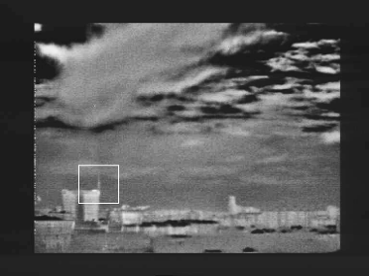 Рис. 1.6 Тепловые контрасты спектральной Рис. 1.7 Тепловые контрасты спектральной области области ∆л=3,5ч5,5 мкм∆л=8ч 14 мкм Для системы тепловизионного мониторинга КС возможно использование как диапазона 3ч5 мкм, так и диапазона 8ч12 мкм. Диапазон 3ч5 мкм позволяет наблюдать слабоконтрастные объекты, что необходимо при ведении мониторинга, также помимо лучшего температурного контраста, на этот диапазон приходится максимум спектра излучения факела пламени и большинства строительных материалов. А диапазон 8ч12 мкм более выгоден на длинных дистанциях и соответствует наблюдаемому диапазону температур. Поэтому оптимальным решением для задач мониторинга является использование двух диапазонов одновременно, что позволит совместить их преимущества и сгладить недостатки. 1.3. Состояние рынка тепловизионных камер1.4 Тепловизионные системы контроля КСНа сегодняшний день в России не существует систем тепловизионного контроля КС за исключением ТепСКО СП-1 АСДМ «Лидар». Представленные на рынке системы предназначены для охранной, поисково-спасательной деятельности, медицинской диагностики, а также нужд промышленности и мало подходят для мониторинга КС. В настоящее время в системе «АСДМ-Лидар» в тепловизионном канале СП-1 используется тепловизор «Скат». Поле зрения объектива тепловизора «Скат» равно 18х14 угл. град., причём конструкция тепловизора позволяет использовать объективы с меньшим полем зрения для обеспечения надёжного обнаружения КС (на предельных расстояниях), сопровождающихся тепловыми выбросами. Тепловизор «Скат» работает в диапазоне 8¸13 мкм, имеет разрешение 320х240 точек, не требует охлаждения жидким азотом. Интерфейс связи с компьютером RS-485. Для вывода изображения в телевизионном стандарте используется цифро-аналоговый преобразователь, установленный между системным блоком компьютера и его монитором. Тепловизор установлен на опорно-поворотное устройство, позволяющее направлять его на нужный сектор панорамы. Поле зрения тепловизора совпадает с полем визирующей камеры. Система функционирует с 2007 г. по нынешний день и в ходе реальной эксплуатации показала пригодность тепловизора «Скат» для мониторинга КС. Частота кадров 25 Гц позволяет вести мониторинг в реальном времени. ТепСКО СП-1 при хороших погодных условиях обеспечивает видимость до 12 км (Останкинская телебашня на рис. 1.8). Для СП-1 существуют два штатных тест-объекта: здание завода «Фрезер» находящееся на расстоянии 800 м от поста и здание НИИ «Орион» на расстоянии 2 км. Тепловизионный канал СП-1 дает возможность получать контрастное изображение дымов на фоне городской застройки и неба.