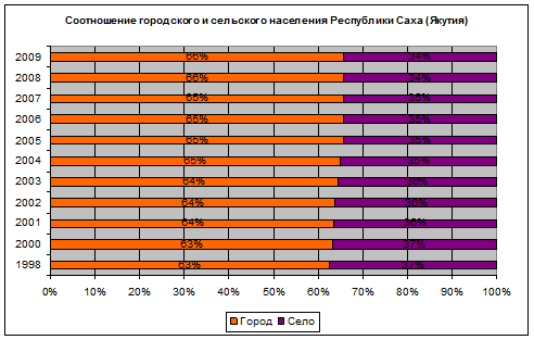 Т.е. городское население в 2008 году увеличилось примерно на 2,5% по сравнению с 2000 годом. Таким образом, для внутренней региональной миграции характерна тенденция перетока сельского населения республики в городскую местность. Рассмотрим соотношение численности городского и сельского населения за рассматриваемый период. Для этого вычислим относительные величины структуры. Указанные показатели характеризуют доли, удельные веса составных элементов в общем итоге. Как правило, их получают в форме процентного содержания: Таблица 2. Соотношение численности городского и сельского населения Республики Саха за период 1998–2009 годы