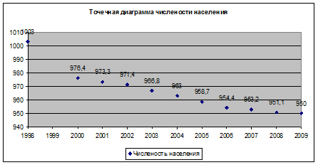 Для прогнозирования общей численности населения Республики Саха (Якутия) к 2012 году выявим функциональную тенденцию значений. Вначале построим точечный график зависимости численности населения республики от года наблюдения: