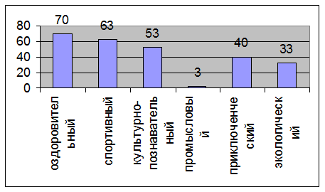 1.Оздоровительный. Это в первую очередь санаторно-курортное лечение (в области 12 здравниц, в том числе 5 санаториев). Наиболее известные из них: Дальняя дача, Кисегач, Увильды. В 2004 году их посетило боле 120 000 человек. Дома и базы отдыха на озерах богаты бальнеологическими ресурсами. 2. Спортивный. Это, в первую очередь туризм на горнолыжных центрах, которых в нашей области насчитывается 17. Наиболее известные из них: Завьялиха, Аджигардак, Солнечная долина. В 2004 году их посетило более 100 000 человек. Еще один вид спортивно-познавательного туризма – спелеологический. В области насчитывается более 450 пещер. Наиболее известные: Сикияз-Тамакский пещерный комплекс, Игнатьевская пещера, Сугомакская пещера (г. Кыштым), Карстовая пещера Кургазакская. 3.Приключенческий. Туристические фирмы предлагают конные, веломаршруты по горной северо-западной части нашей области, сплавы по рекам Юрюзань, Ай, Сим, Урал. 4.Культурно-познавательный. Туры по городам области Челябинск, Миасс, Златоуст, Кыштым, Касли и других. А также посещение археологического комплекса «страны городов», включающее 20 памятников начала 2 тысячелетия до н.э. Наиболее известные из которых Аркаим и Синташтинское поселение. 5.Экологический. В области остро стоят экологические проблемы, поэтому аналогичное направление связано с посещением национальным парков «Таганай», «Зюраткуль». 6.Промысловый. Огромные возможности в области для охотников и рыболовов, площадь только охотничьих угодий составляет 5600 га. На территории области находится 44 заказника. Охотничие и рыболовные базы могут принять одновременно 1737 человек. В общем объеме реализуемых населению платных услуг доля рекреационных, не смотря на резкое их повышение, не достигает даже 10 %, а доля занятых в этой сфере менее 1 % (0,004%) от занятых в народном хозяйстве. Основные проблемы регионального туризма: 1)Существующая материально-техническая база туризма, более чем на 80% устарела и нуждается в реконструкции. 2)На территории области учреждения рекреации, в том числе и санаторно- курортная, размещаются крайне неравномерно. В настоящее время побережья озер Аргаяшского и Сосновского районов перегружены отдыхающими, в среднем в 19 – 20 раз. Все это способствует значительной деградации природы. 3)Имеются нереализованные возможности внутренних туристических ресурсов, которые оцениваются специалистами в 50 млн. долл. в год. Новые туристические комплексы смогут создать дополнительно 120 000 рабочих мест, а для этого необходимы условия, стимулирующие приток в отрасль честных инвестиций. Между тем в Челябинской области есть все необходимые предпосылки для дальнейшего развития уже сложившихся и формирования новых рекреационных районов. Для этого необходимо: 1. Привлекать к работе новых молодых специалистов (зачастую у них есть много идей, которые стоит реализовать), создавать прогрессивную систему туристского образования, повышать квалификацию персоналу туристских фирм и предприятий туристской отрасли. 2. Привлекать как российских, так и зарубежных инвесторов, а для этого нужна реклама туристических комплексов, баз отдыха и т.п. 3. Обеспечивать безопасность отдыха и оздоровления населения. 4. Туристическим фирмам нужно создавать новые, более интересные и доступные маршруты для всех категорий граждан. 5. Совершенствовать нормативно-правовую