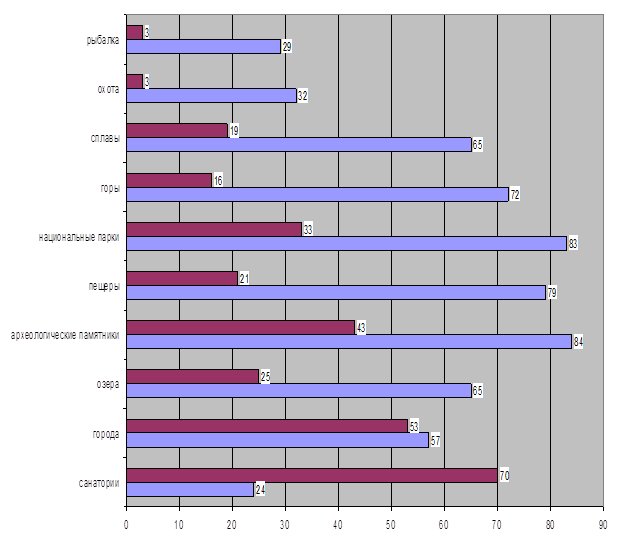Учитывая интерес и пожелания респондентов, мы разработали два своих маршрута для старшеклассников нашей школы. Первый: «Медно - золотое кольцо Урала» (по городам Челябинской области: Касли – Кыштым – Карабаш – Златоуст - Миасс – Челябинск). Второй: веломаршрут по озерам: Киреты-Сунгуль-Силач-Б.Аллаки-Б.Кисегач-Б.Касли-Иртяш (Приложение 3). Заключение Таким образом, на основании собранных и проанализированных материалов можно сделать следующие выводы: 1. Челябинская область обладает различными рекреационными ресурсами: орографическими, гидрологическими, биоклиматическими. 2. В области представлены практически все виды современного туризма: оздоровительного, спортивного, приключенческого, промыслового, фестивального, делового. 3. Большинство туристических фирм стали интенсивнее сотрудничать с местными курортами, санаториями, домами и базами отдыха. Особым спросом пользуется недорогой семейный отдых на местных базах, водный туризм – сплавы по рекам Юрюзань, Ай, Урал, Уфа, Б. Сатка, Березяк, конные маршруты, туристические лагеря, экскурсионные маршруты по горному маршруту. 4. При анализе анкет учащихся старших классов школы №21 были разработаны туристические маршруты по городам и озёрам области с целью удовлетворения их познавательного интереса. 5. Туристическая индустрия Челябинской области имеет ряд серьёзных проблем которые необходимо решать на федеральном и муниципальном уровнях. Список используемой литературы 1.География Челябинской области: учебное пособие /А.С.Маркова, М.А.Андреева: под ред. Е.П.Журавлевой. - Челябинск: Южно – Уральское книжное издательство, 2002. – 319 с. 2.Волков Л.Д. Горнолыжные центры Южного Урала//Уральский туристский вестник. – 2004. - № 2. – с. 4. 3.Гиттис М.С., Филиппов А.Г.Аша, Верхнеуральск, Сатка, Усть-Катав, Златоуст//Туризм и отдых на Южном Урале. – 2004. – с. 2 – 26. 4.Перспективы развития въездного туризма в Екатеринбурге в 2000 – 2003 г.: учебное пособие/ Под редакцией Д.В.Бугрова. Екатеринбург: НПМП «Волот», 2000. – с. 35. 5.Гуляев В.Г. Организация туристской деятельности: учебное пособие. М.: Нолидж, 1996. – 312 с. 6. Шувалов Н.И. От Парижа до Берлина по карте Челябинской области. - Челябинск: Южно-Уральское книжное издательство, 1989. – 158 с. 7. Гиттис М.С., Моисеев А.П. – Челябинск: АБРИС, 2003. – 112с. 8. Моисеев А.П., Николаева М.Е. Памятники природы Челябинской области. - Челябинск: Южно-Уральское книжное издательство, 1987. – 256с. Приложение 1 Основные виды туризма, предлагаемые фирмами