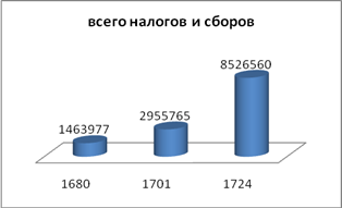 Согласно государственной росписи 1724г. (см. приложение 1) окладной доход государства был определен в 8,5 млн. руб., по фактическому исполнению он составил сумму в 8 172 433 руб., а с остатком 1723г. – 10 355 597 руб. Подушная подать по окладу составляла сумму в 4 614 638 руб., или 54,1% поступлений этого года, а вместе с ясачными – 4 731 051 руб., или 55,5%. Таблица 4. Сравнительный анализ налоговых поступлений за 1680, 1701 и 1724гг.[12]