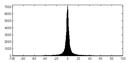 Рис. 2. Гистограмма значений коэффициентов ДКП блоков 8×8 пикселей тестового изображения Barbara при ШК=1 Как видно, приведенные на рис. 1 и 2 распределения достаточно похожи. На рис. 3 приведен график энтропии данных, имеющих обобщенное Гауссовское распределение с рис. 1, а на рис. 4 – графики энтропии для квантованных коэффициентов реальных изображений.