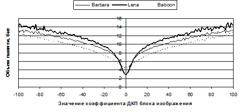Рис. 4. Энтропия коэффициентов ДКП тестовых изображений Barbara, Lena и Baboon для ШК=1 Как видно из рис. 4, графики энтропии для реальных изображений являются подобными, но не идентичными друг другу. Для точной оценки их формы нужно знать параметры На рис. 5 приведены графики энтропии коэффициентов ДКП для одного и того же изображения, но при разных шагах квантования.