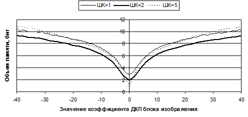 Рис. 5. Энтропия коэффициентов ДКП изображения для разных ШК На примере графиков, приведенных на рис. 4 и 5, показано, что зависимость энтропии от значения коэффициента ДКП является разной как для различных изображений, так и для одного и того же изображения, но для разных шагов квантования. В то же время форма этих зависимостей и их параметры отличаются не очень существенно и могут быть для простоты вычислений приближенно аппроксимированы, например, функцией, приведенной на рис. 6.