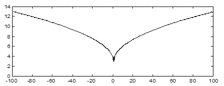Рис. 6. График функции Что же происходит с законом распределения и энтропией коэффициентов ДКП при искажении изображения, например, импульсным шумом? Гистограмма значений коэффициентов ДКП существенно изменяется (рис. 7 в сравнении с рис. 2), а суммарная энтропия коэффициентов ДКП резко возрастает (см. рис. 8).