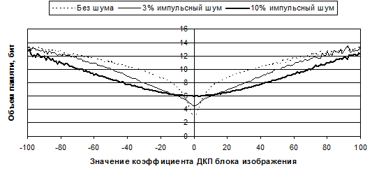 Рис. 8. Энтропия коэффициентов ДКП тестового изображения Barbara при ШК=1 для импульсного шума с вероятностями 0, 3 и 10 % Собственно, так как ДКП минимизирует энтропию в блоке изображения, то внесение любых случайных искажений будет приводить к ее повышению, а задача нахождения истинных (неискаженных) значений утерянных пикселей сводится к такому изменению значения утраченного пикселя (или группы пикселей), которое приведет к минимизации суммарной энтропии коэффициентов ДКП блока. Основная идея предлагаемого подхода – за счет варьирования значения заданного пикселя попытаться минимизировать энтропию коэффициентов DCT в блоке изображения и, таким образом, найти истинное значение этого пикселя. При этом, уменьшение модулей коэффициентов, близких к нулю, будет иметь большее значение, чем уменьшение коэффициентов с большими значениями модулей. В результате такой минимизации энтропии будут подавлены (уменьшены) в основном коэффициенты, близкие к нулю, а информационная часть коэффициентов, сосредоточенная в длинных хвостах гистограммы, останется без больших изменений. При вычислении суммарной энтропии коэффициентов ДКП блоков можно воспользоваться выражениями (1) и (2), но вычислительно проще аппроксимировать их функцией, приведенной на рис. 6. При этом, целевая функция, которую нужно минимизировать для какого-то блока изображения, примет вид: