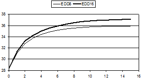 По результатам анализа данных табл. 3–5 можно сделать несколько выводов. Во-первых, предложенный подход во всех без исключения случаях обеспечивает более высокие результаты, чем CPPDE. Во-вторых, для текстурных изображений, подобных изображению Barbara, выигрыш особенно велик и достигает 7 дБ. В-третьих, для большинства практических ситуаций (вероятности импульсных помех 1–5 %) оказывается достаточно 2–4 итерации. По результатам детектирования импульсного шума можно оценить его вероятность и выбрать число итераций. И, наконец, следует отметить, что выигрыш несколько уменьшается с ростом вероятности импульсных помех. Одной из причин этого, возможно, является то, что при большом числе неизвестных пикселей размера окна 8×8 оказывается уже недостаточно для эффективной реконструкции изображения (что косвенно подтверждается большим числом необходимых итераций в этом случае) и в данной ситуации целесообразно использовать размер окна 16×16 пикселей. На рис. 10 приведен график ПССШ от числа итераций для изображения Barbara при вероятности импульсных помех 40 % и для размеров блока 8×8 и 16×16 (EDD16).