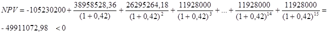 Внутренняя норма доходности: Так как внутренняя норма доходности очень велика, рассчитаем NPV при i = 42 %