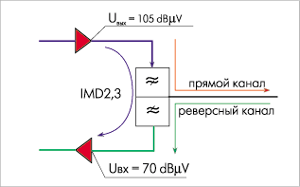 Рис.7 Рис.8 Диплексерная развязка (Decoupling between Forward/Return channel), т.е. уровень развязки между прямым и обратным каналами. Этот параметр редко приводится в паспортных данных на усилители. Тем не менее он является одним из важнейших при внедрении услуг интерактивного сервиса. Уровень развязки определяется избирательностью ФНЧ и ФВЧ. Требуемая величина избирательности ФНЧ (см. рис.5) объясняется простым условием обеспечения устойчивости (в первую очередь усилителя реверсного канала), т.к. усилитель прямого канала по отношению к реверсному является петлей положительной обратной связи. Достаточно выполнения традиционных условий баланса фаз и баланса амплитуд, чтобы усилитель возбудился. Так как коэффициент передачи усилителя обычно не превышает 40.45 dB, достаточно избирательности ФНЧ величиной 20.25 dB. Совершенно по-иному стоит вопрос с избирательностью ФВЧ. Основное его назначение - препятствовать проникновению продуктов интермодуляции 2-го и 3-го порядков с выхода усилителя прямого канала на вход усилителя реверсного канала. Так как шаг частотной сетки составляет 8 МГц (OIRT), то комбинационные помехи будут группироваться вблизи частот 8, 16, 24. ±0,5 МГц. Приняв, для определенности, Uвых = 105 dBmV (см. рис.6), IMD = 60 dB и избирательность ФВЧ a = 25 dB, получим, что уровень помехи, развиваемой на входе усилителя реверсного канала, составит 20 dBmV, что эквивалентно формированию отношения сигнал/помеха S/D = 50 dB при входном уровне сигнала реверсного канала Uвх = 70 dBmV. При трансляции сигналов в цифровых форматах, чувствительных к воздействию синхронных помех (с учетом их накопления по магистрали), такое отношение S/D является недопустимым. Учитывая накопленный опыт внедрения услуг интерактивного сервиса, ряд крупных фирм-производителей магистрального оборудования, таких как Hirschmann, Philips, Arcodan и др., используют частотные диплексеры с избирательностью не менее 40 dB (например, серии GPV., LA/DA, Hirschmann; 93188 Arcodan), а в последних моделях (GLV., GPV851, GPV841) - с гарантированной (приводимой в паспортных параметрах) избирательностью не менее 63 dB! (с указанием также времени задержки в полосе канала).