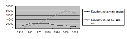 В Україні зараз близько 820 кредитних спілок. Лише в Києві їх більше ста, хоча реально працює, на думку спеціалістів, зо три десятки. Фахівці в галузі кредитного руху зазначають, що цей сегмент ринку має достатній запас розвитку, але для цього треба вирішити комплекс взаємопов’язаних питань. Понад 60 млн. громадян США є членами кредитних спілок, у Канаді створено масштабну систему, половина населення Ірландії є членами кредитних спілок (хоча цю ідею було привнесено в країну лише на початку 50-х років минулого століття). Вражають динамікою розвитку польські кредитні спілки. На сьогодні сумарні активи 140 польських кредитних спілок складають 445 млн. доларів США. Понад 500 тисяч громадян Польщі стали членами кредитних спілок за 10 років. Першість за числом членів КС та їх загальній кількості тримають США. Разом з тим, за залученістю населення в кредитні спілки немає рівних Ірландії, де дозволяється, до того ж, бути членом одразу кількох кредитних спілок. За першими трьома ознаками в таблиці високі показники мають і деякі інші регіони та країни, зокрема Канада, Румунія, Австралія та Океанія. Звертає на себе увагу відносно слабкий розвиток кредитних спілок в Європі, враховуючи її економічний потенціал. Всього 11 країн Європи входять до Всесвітньої ради кредитних спілок, до того ж тільки Ірландія характеризується високим рівнем розвитку кредитних спілок, а Англія – середнім. Відсутні кредитні спілки в таких розвинутих країнах, як Німеччина, Франція, Італія, Іспанія та ін. В цих країнах отримала розвиток інша форма кооперації – кредитні кооперативи та банки. В Україні кредитні спілки, чи на те, що після їх відновлення минуло небагато часу, поступово завойовують свою нішу на ринку кредитів населенню. Останніми роками в розвитку таких спілок спостерігаються як позитивні, такі негативні тенденції. Втім, позитивна динаміка розвитку кредитних спілок унаслідок кризи кредитної системи була зведена нанівець. Україна знаходиться на початковій стадії розвитку кредитних спілок. Характерно, що навіть африканські країни, не кажучи про латиноамериканські та азіатські, значно випереджають Україну. Рівень активів в Україні на одну кредитну спілку менше середньосвітового в 38 разів (в Росії – у 22 рази). Рівень заощаджень в Україні на одного члена КС становить 244 дол. США, що на 316 дол. нижче за середньосвітовий рівень. Але незважаючи на це, кредитні спілки ростуть в Україні доволі швидкими темпами. Розглянемо більш детально розвиток кредитних спілок в деяких країнах та порівняємо його з Україною. До середини ХХ століття кредитні спілки США володіли невеликими активами, які не перевищували, як правило, 100 тис. дол. При цьому кількість членів КС складала в середньому не більше 500 чоловік, постійний персонал нараховував 1-2 співробітника. Спектр послуг був також дуже обмежений. З 50х рр. почався стрімкий розвиток кредитних спілок в США в кількісному та якісному відношенні. Ці зміни наведені на рис. 1 та рис. 2.