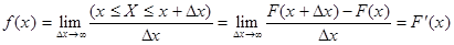 В случае непрерывной случайной величины мы сталкиваемся с ситуацией, когда событие принципиально может произойти в результате испытания, но имеет вероятность равную 0. Это надо трактовать так, что распределения непрерывных случайных величин дают нам значения вероятности р = f(x) не для данного значения х случайной величины, а для интервала значений Δ х , примыкающего к х. Поэтому возможно такое определение Определение. Случайная величина X называется непрерывной, если ее пространством элементарных событий является вся числовая ось (либо отрезок (отрезки) числовой оси), а вероятность наступления любого элементарного события равна нулю. Естественны следствия такого определения. 1.F(b)-F(a) = P(a£ X< b) = P(a£ X £b) 2.Неотрицательная числовая функция f(x) действительного аргумента x называется плотностью вероятности, и существует в точке x, если в этой точке существует предел:
