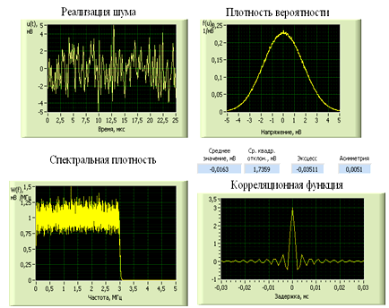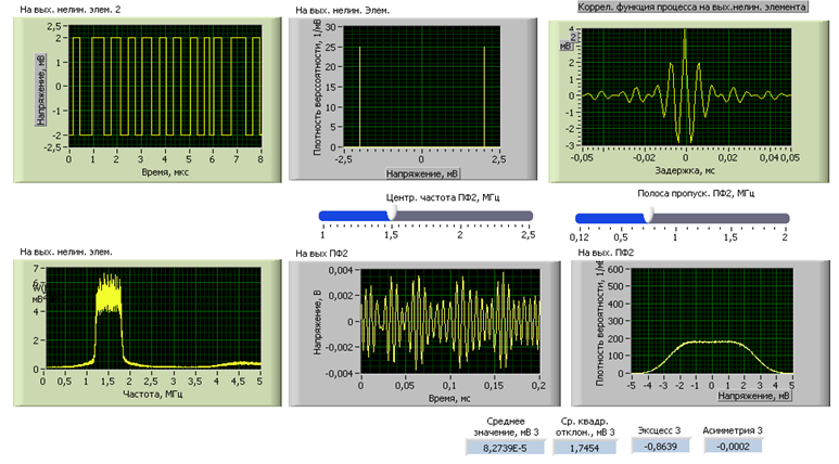Рис. 13 На выходе узкополосной цепи опять получим сигнал с нормальным распределением, и этот закон тем ближе будет к нормальному, чем ýже полоса пропускания используемой линейной цепи. 3. Исследование на LabVIEW линейных преобразований случайных процессов и явления нормализацииИсследование влияния полосы фильтра на вид и параметры реализации случайного процесса Количество реализаций: 200. Тип фильтра: НЧ Баттерворта. Порядок фильтра НЧ: 50. Выполнение: а) Частота среза фильтра НЧ: 3 МГц Полученные данные показаны на рис. 1