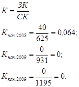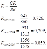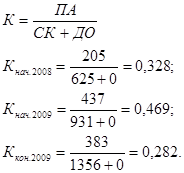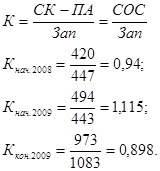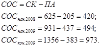 Данные табл. 7 позволяют увидеть, что в 2009 году происходит замедление оборачиваемости чистых активов на 31 день, что вызвано сокращением выручки от продаж продукции (на 11,04%) при возрастании среднегодовой стоимости чистых активов (на 47,45%). Рентабельность чистых активов изменилась на 25,29%. В отчетном году значение рентабельности чистых активов составило 44,6%. Это означает, что с каждого рубля собственных средств предприятие получает 45 коп. чистой прибыли. 2.4 Расчет основных коэффициентов и определение типа финансовой устойчивости по показателю Е. Альтмана Коэффициент маневренности. Проводим расчет данного коэффициента, при этом сначала выясняем значения СК, ПА и СОС.
