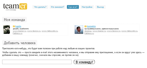 «Где все?» концентрирует в себе тех людей, с которыми вы взаимодействуете в рамках Teamer'а, здесь же вы можете пригласить кого-нибудь ещё, чтобы поработать совместно:
