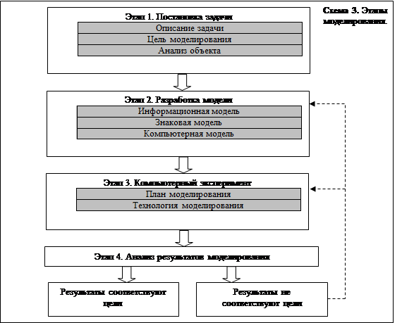 Постановка задачи · Описание задачи Задача (или проблема) формулируется на обычном языке, и описание должно быть понятным. Главное на этом этапе - определить объект моделирования и понять, что собой должен представлять результат. · Формулировка цели моделирования Целями моделирования могут быть: - познание окружающего мира; - создание объектов с заданными свойствами (эта цель соответствует постановке задачи "как сделать, чтобы…"); - определение последствий воздействия на объект и принятие правильного решения (эта цель соответствует постановке задачи "что будет, если…"); - определение эффективности управления объектом (процессом). · Анализ объекта На этом этапе, отталкиваясь от общей формулировки задачи, четко выделяют моделируемый объект и его основные свойства. Поскольку в большинстве случаев исходный объект - это целая совокупность более мелких составляющих, находящихся в некоторой взаимосвязи, то анализ объекта будет подразумевать разложение (расчленение) объекта с целью выявления составляющих и характера связей между ними. 2. Разработка модели · Информационная модель На этом этапе выявляются свойства, состояния и другие характеристики элементарных объектов, формируется представление об элементарных объектах, составляющих исходный объект, т.е. информационная модель. · Знаковая модель Информационная модель, как правило, представляется в той или иной знаковой форме, которая может быть либо компьютерной, либо некомпьютерной. · Компьютерная модель Существует большое количество программных комплексов, которые позволяют проводить исследование (моделирование) информационных моделей. Каждая среда имеет свой инструментарий и позволяет работать с определенными видами информационных объектов, что обуславливает проблему выбора наиболее удобной и эффективной среды для решения поставленной задачи. 3. Компьютерный эксперимент · План моделирования План моделирования должен отражать последовательность работы с моделью. Первыми пунктами в таком плане должны стоять разработка теста и тестирование модели. Тестирование - процесс проверки правильности модели. Тест - набор исходных данных, для которых заранее известен результат. В случае несовпадения тестовых значений необходимо искать и устранять причину. · Технология моделирования Технология моделирования - совокупность целенаправленных действий пользователя над компьютерной моделью. 4. Анализ результатов моделирования Конечная цель моделирования - принятие решения, которое должно быть выработано на основе всестороннего анализа полученных результатов. Этот этап решающий - либо исследование продолжается (возврат на 2 или 3 этапы), либо заканчивается. Основой для выработки решения служат результаты тестирования и экспериментов. Если результаты не соответствуют целям поставленной задачи, значит, допущены ошибки на предыдущих этапах. Это может быть слишком упрощенное построение информационной модели, либо неудачный выбор метода или среды моделирования, либо нарушение технологических приемов при построении модели. Если такие ошибки выявлены, то требуется редактирование модели, т.е. возврат к одному из предыдущих этапов. Процесс продолжается до тех пор, пока результаты моделирования не будут отвечать целям моделирования. При решении конкретной задачи какой-то из 
