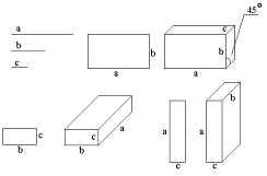 Рис.5. Образцы паркетов 3 этап. Компьютерный эксперимент План ЭКСПЕРИМЕНТА 1. Тестирование стандартного набора деталей - проверка совместимости. 2. Разработка паркетного блока. 3. Тестирование блоков - проверка их совместимости. 4. Моделирование эскизов паркета. ПРОВЕДЕНИЕ ИССЛЕДОВАНИЯ 1. Разработайте несколько вариантов паркетного блока и эскизов паркета. 2. Предложите их на выбор заказчику. 4 этап. Анализ результатов Если вид паркета не соответствует замыслу заказчика, то вернуться к одному из предыдущих этапов: создать другой блок из того же набора деталей или разработать другой набор деталей. Если вид паркета удовлетворяет заказчика, то принимается решение о разработке чертежей в реальном масштабе и подборе материалов. Задания для самостоятельной работы: 1. Представьте, что Вы - глава фабрики по производству ткани. Разработайте образцы тканей с геометрическим орнаментом. 2. Представьте, что Вы - мастер по созданию витражей. Разработайте набор стекол для составления витражей и создайте витраж. 3. Представьте, что к вам пришел директор фабрики игрушек. Он просит, чтобы Вы разработали набор деталей мозаики и продемонстрировали, какие узоры можно будет складывать из этих деталей. 4. Создайте меню чайного или кофейного сервиза (вид сверху) и "накройте" праздничный стол на шесть персон по правилам этикета. 5. Представьте, что Вы - художник фабрики по производству керамической плитки. Разработайте набор керамических плиток и на его основе создайте объекты подводного мира для моделирования композиции "Под водой" для ванной комнаты. 6. Представьте, что Вы - художник мастерской, специализирующейся на производстве ковров. Разработайте образец ковра. 7. Представьте, что Вы - главный специалист фабрики, производящей ковровое покрытие. Разработайте образцы ковровых покрытий для детской комнаты. 8. Одно из последних направлений в дизайне интерьера - отделка потолка специально предназначенной для этих целей плиткой. Разработайте набор потолочных плиток для украшения фойе театра. 9. Как преображается город, когда тротуары, скверы, площади вымощены брусчаткой (тротуарной плиткой). Попробуйте свои силы в качестве художника завода по производству брусчатки. Разработайте несколько вариантов плитки для тротуаров. 10. Линолеум - очень практичное покрытие, не требующее специального ухода. Но, говоря о практичности, нельзя забывать о красоте. Разработайте несколько образцов линолеума, имитирующего мраморное покрытие. Лабораторная работа № 3 "Моделирование объемных конструкций" Задача. "Создание набора кирпичиков для конструирования" 1 этап. Постановка задачи ОПИСАНИЕ ЗАДАЧИ Создать набор кирпичиков, с заданными параметрами a, b, c (см. рис.1).
