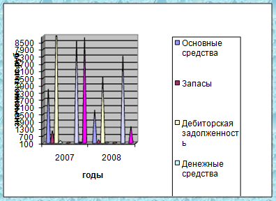 Уменьшение (в абсолютном выражении) валюты баланса за отчетный период на 8816 тыс.руб. ( на 01.01.08г. – 17.609 тыс. руб. ; на 31.12.08г. – 8.793 тыс.руб.) или на 50,1 % к величине валюты баланса на 01.01.08г. свидетельствует о сокращении обществом хозяйственного оборота и сворачивании хозяйственной деятельности. О сворачивании хозяйственной деятельности свидетельствует также уменьшение (в абсолютном выражении) основных средств на 1759 тыс. руб. ( на 01.01.08г. - 4.577 тыс. руб. ; на 31.12.08г. – 2.818 тыс. руб. ) или на 38,4 % к величине основных средств на 01.01.08г. В бухгалтерском балансе основные средства отражаются за вычетом начисленной амортизации по основным средствам, учтенной на счете 02 «Амортизация основных средств». Не смотря на абсолютную величину снижения основных средств на 31.12.08г., внеоборотные активы в структуре актива баланса на 01.01.08г. занимали 26,0 %, на 31.12.08г. составили 32,0 %. Показатель коэффициент износа, рассчитывается, как отношение суммы, начисленной амортизации, учтенной на счете 02, к стоимости основных средств. Коэффициент износа (Кизноса) характеризует степень изношенности основных средств. На 01.01.08г. Кизноса – 53,1 % , на 31.12.08г. Кизноса – 36,7 %. При сворачивании хозяйственной деятельности в первую очередь выбыли (продажа и ликвидация) основные средства полностью амортизированные. Уменьшение (в абсолютном выражении) оборотных активов на 7.057 тыс. руб., в том числе, уменьшение запасов на 759 тыс. руб., денежных средств на 281 тыс. руб., дебиторской задолженности на 6.017 тыс. руб., и одновременное снижение кредиторской задолженности на 7.386 тыс. руб. ( на 01.01.08г. –8.853 тыс. руб. ; на 31.12.08г.–1.467 тыс. руб.) свидетельствует о том, что не смотря на сокращение хозяйственного оборота, денежные средства, полученные от реализации готовой продукции, от поступления дебиторской задолженности, были направлены на погашение кредиторской задолженности. Уменьшение дебиторской задолженности на 6.017 тыс. руб. означает, что покупатели и заказчики своевременно рассчитывались за поставленную продукцию, своевременное возмещение сумм налога на добавленную стоимость из бюджета по операциям, облагаемых ставкой 0 %. На 31.12.08г. снижение кредиторской задолженности составило 83,4 % к величине кредиторской задолженности на 01.01.08г. Доля кредиторской задолженности в валюте баланса пассива по состоянию на 31.12.08г. составляет 16,7 %. Значительное снижение кредиторской задолженности положительно характеризует ООО «Экспромт», как добросовестного партнера. Отсутствие заемных средств на 31.12.08г. свидетельствует о том, что общество не является зависимым от заемных средств других организаций - положительный фактор. Величина нераспределенной прибыли на 31.12.08г. уменьшилась на 1292 тыс. рублей на сумму убытка полученного по результатам финансово-хозяйственной деятельности общества в 2008г. Не смотря на уменьшение нераспределенной прибыли, доля нераспределенной прибыли в валюте баланса пассива на 31.12.08г. составляет 83,3 % по сравнению с 48,9 % на 01.01.08г . На основе данных таблицы 16 создадим гистограмму.