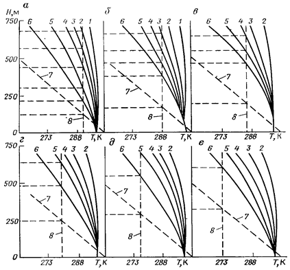 Рисунок 3.9 - Изменение температуры с глубиной скважины при различных коэффициентах теплопередачи. Коэффициент теплопередачи (в Вт/ (м2 *К) /: 1 - 1,2; 2 - 6; 3 - 12; 4 - 7; 5 - 23; 6 - 29; 7 - геотермический градиент; 8 - равновесная температура образования гидратов; а - е - годы разработки: первый, второй, четвертый, шестой, восьмой, десятый Рассмотрим для данного примера изменение проектного безгидратного дебита газа в процессе разработки месторождения. Вправо от точки А и выше кривой 2 гидраты не образуются. В первые два года разработки безгидратный дебит скважин находится в пределах 1 - 0,7 млн. м3 /сут. В последующие годы принятый по проекту рабочий дебит скважины обеспечивает безгидратный режим скважин.