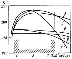 Рисунок 3.13 - Изменение температуры газа и равновесной температуры образования гидратов в зависимости от дебита при различных диаметрах в фонтанных труб. Кривые температуры на устье: 1 - в = 220 мм (пятый год разработки); 2 - в = 180 мм (первый год разработки); 3 - в = 220 мм (первый год разработки; 4 - в = 220 мм (пятый год разработки), 6 - в = 220 мм (первый год разработки) Следует указать, что существует такой дебит, выше и ниже которого температура газа на устье не повышается, а снижается (см, кривую 2 на рисунке 3.11). Объясняется это тем, что при низких дебитах температура газа на устье в основном зависит от теплообмена газа со стенками скважины, а при высоких дебитах за счет увеличения их потерь на трение эффект Джоуля - Томпсона начинает преобладать над эффектом теплообмена. Образование гидратов в стволе можно предупредить теплоизоляцией фонтанных или обсадных колонн, повышением температуры газа в стволе с помощью нагревателей. Самый распространенный способ предупреждения образования гидратов - подача ингибиторов (метанола, гликолей) в поток газа. Иногда подача ингибитора осуществляется через затрубное пространство. Выбор реагента зависит от многих факторов.