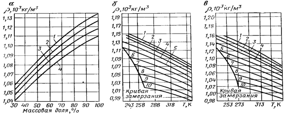 Рисунок 4.11 - Зависимость вязкости водных растворов гликолей от температуры. А - ЭГ; б - ДЭГ; в - ТЭГ; содержание гликоля (%): 1 - 10; 2 - 25; 3 - 50; 4 - кривая замерзания Гликоли с водой также смешиваются в любых соотношениях. Плотность водных растворов гликолей и температуру их замерзания можно определить по графикам (рисунок 4.12 и 4.13). Наиболее низкие температуры замерзания этих растворов находятся в пределах концентрации 60 - 70%, которые являются оптимальными при использовании гликолей в качестве ингибиторов гидратов. Так как упругость паров гликолей при температуре образования гидратов небольшая (рисунок 4.14), то они при вводе в трубопровод практически полностью остаются в жидкой фазе, что упрощает их улавливание для повторного использования. Регенерация гликолей проводится до получения свежего раствора. Потери гликолей при использовании их в качестве ингибиторов гидратов складываются из потерь при регенерации (термическое разложение и унос), потерь в результате неполного отделения от газа в сепараторах, растворения гликолей в конденсате и газе, всевозможных утечек и др.