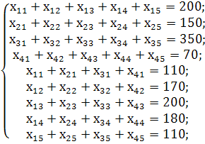 Економічний зміст записаних обмежень полягає в тому, що весь вантаж потрібно перевезти по пунктах повністю. Аналогічні обмеження можна записати відносно замовників: вантаж, що може надходити до споживача від чотирьох баз, має повністю задовольняти його попит. Математично це записується так: