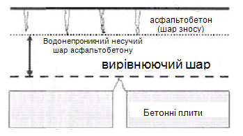 Рисунок 7.6 - Схема випробування Обрахунок результатів проводили за Результати експерименту виявилися несподіваними. Вони показали, що найкраще сітка працює у шарі підсилення знаходячись по середині даного шару. Але ці результати потрібно ще детальніше проаналізувати і при можливості перевірити таким же експериментом. 7.3 Застосування щебенево - мастичного асфальтобетону Появу щебенево - мастичного асфальтобетону (ЩМА) відносять до 60-х років. В цей період спостерігались багато чисельні пошкодження дорожніх одягів. Результатом ряду розробок став ЩМА з дрібним щебенем. Цей матеріал задовольняв пред’являэмим йому вимогам, таким як: 1) висока стійкість під дією великих навантажень; 2) висока стійкість при високих температурах; 3)опір дії шин з шипами. Ідея полягала в тому, щоб створити стійкий щебеневий склад для відводу(розподілу) транспортних навантажень і заповнювати його бітумною мастикою до отримання бажаної величини залишкової пористості. ЩМА складається з щебеню високого ґатунку з переривистим гранулометричним складом, дробленого піску, мінерального порошку, дорожнього бітуму і стабілізуючих добавок. В ЩМА застосовується велика кількість бітуму. Це необхідно для отримання товстих плівок бітуму, які навіть після довготривалої експлуатації перешкоджають його старінню під дією кисню повітря, а також тріщиноутворенню. Склад і структура ЩМА визначають його експлуатаційні властивості. ЩМА особливо придатний для застосування в покриттях доріг при інтенсивному русі важких транспортних засобів. Важливою перевагою ЩМА є те, що його можна вкладати в якості шару зносу нерівномірної товщини. Таблиця 7.2 Властивості і особливості щебенево-мастичного асфальтобетону