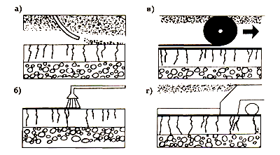 Рисунок 7.4 – Послідовність технологічних операцій при ремонті асфальтобетонних покриттів підсилених геосіткою а) очищення поверхні; б) нанесення бітумної емульсії; в) розкочування геосітки; г) укладання асфальтобетонної суміші. Роботи варто проводити в присутності фахівця, що має досвід укладання геосіток. Варто звертати увагу на те, щоб роботи проводилися в суху погоду й, щоб у покладені шари не проникала волога. В закінченні можна зробити наступні висновки: – із застосуванням у шарах дорожніх одягів геосіток зі скловолокна можна значно збільшити строк їхньої експлуатації. Це в цілому означає тривалу працездатність доріг; – посилення зі скловолокна, через свої гарні технічні дані при їхньому застосуванні в шарах асфальтобетону в умовах суворого клімату виявляють кращі результати, ніж ґрати з полімеру.