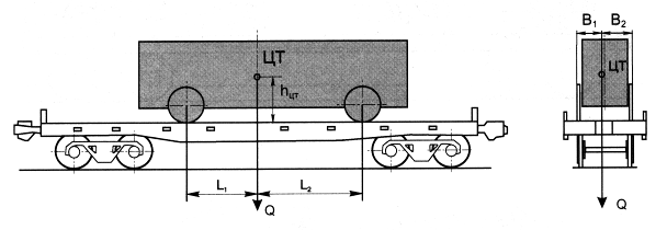 3.4 Погрузка и размещение на подвижной состав 3.4.1. В соответствии с правилами, прием к перевозке груза мелкими отправками (коме продовольственных и промышленных товаров народного потребления и домашних вещей) планируют с мест общего и необщего пользования по развернутым планам перевозок и декадным заявкам грузоотправителей, согласованным с начальником станции. В целях защиты интересов отправителя ему предоставляется право объявить ценность груза предъявляемого к перевозке (статья 16 Устава) Оформление перевозочных документов на такие грузы должно осуществляться в порядке установленном «Правилами перевозки». Объявления ценности обязательно при перевозке драгоценных металлов камней и изделий музейных и антикварных ценностей предметов искусства художественных изделий грузов 3.4.2. Объявление ценности в отношении указанных грузов вынуждает перевозчика уделять их перевозке повышенную заботу и внимание, что требует определенных дополнительных организованных технических мер. За объявленную ценность грузов взимается сбор указанной в «Тарифном руководстве № 4». Они зависят от объявленной ценности и расстояние перевозки. Сбор за объявленную ценность предотвращает так же возможности завышения грузоотправителя размера, объявлена им ценность. В целях повышения достоверности размера объявленной грузоотправителя ценности груза станция на основание статьи 27 Устава имеет права проверить ее соответствии физического состояния груза. При предъявлении груза с объявленной ценностью грузоотправитель в месте с накладной предоставляет станции опись на перевозку груза с объявленной ценностью. Опись составляется в двух экземплярах. Техническими условиями устанавливаются способы размещения и крепления на платформах и в полувагонах машин на колесном ходу, автомобилей, тракторов, прицепов, полуприцепов — и другой техники с обрезиненными и стальными колесами, имеющих: - вес Q отдельных единицы техники не должна превышать: · с обрезиненными колесами при наличии исправной тормозной системы — 24 т, при ее отсутствии — 7т; · со стальными колесами при наличии исправной тормозной системы — 15 т, при ее отсутствии — 5т; - наветренная поверхность каждой единицы техники, размещенной в вагоне, не должна превышать 3 м2 на 1 т ее массы; - расстояние Lmin от плоскости, проведенной через центр тяжести единицы техники параллельно поперечной плоскости симметрии вагона, до ближайшей точки опирания единицы техники должно быть не менее высоты ее центра тяжести от пола вагона h цт , т. е. при L 2> L 1 и L 1> h цт ; -расстояние Вmin от плоскости, проведенной через центр тяжести единицы техники параллельно продольной плоскости симметрии вагона, до ближайшей точки опирания единицы техники должно быть не менее 80% высоты ее центра тяжести от пола вагона h цт , т. е. при B 2> B 1 и B 1>0,8 h цт ;
