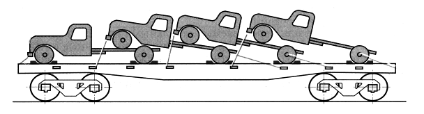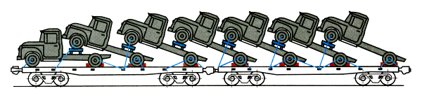 Не допускается размещение автокранов, экскаваторов, легковых автомобилей, грузовых автомобилей, укомплектованных специальным ценным оборудованием, над местом сцепления вагонов. Единицу техники с металлическими колесами без гребней или с обрезиненными колесами при размещении на платформы устанавливают непосредственно на пол. Задние борта единиц техники, за исключением установленных последними, должны быть открыты и закреплены имеющимися на них специальными цепями или проволокой. Размещение и крепление единиц техники в наклонном положении в вагоне или сцепе из них производят в зависимости от конструктивных особенностей таких единиц техники. 2 Классификация подвижного состава