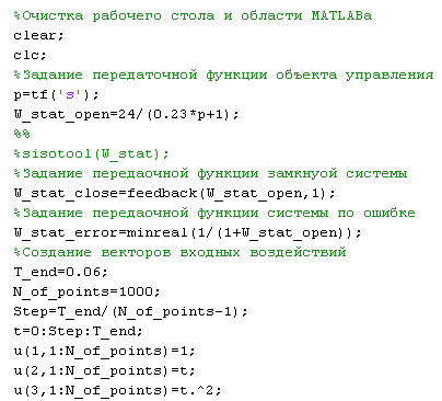 По ЛАЧХ и ЛФЧХ разомкнутой системы (рисунок 1.3) можно сказать, что система в замкнутом состоянии будет устойчива. Тогда рассчитаем аналитически ошибки системы в типовых режимах:2.5 - ошибка по положению равна - ошибка по скорости - ошибка по ускорению равна Эти значения соответствуют результатам построения переходных процессов (рисунок 1.4).