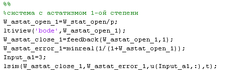 1.1 Исследование статической системысистема автоматический управление астатизм коррекция В соответствии с индивидуальным заданием пронаблюдаем за влиянием степени астатизма системы на точность и устойчивость системы автоматического управления, передаточная функция которой в разомкнутом состоянии представлена выражением: