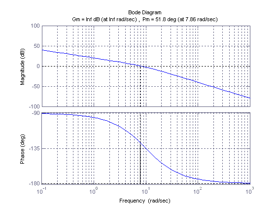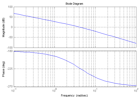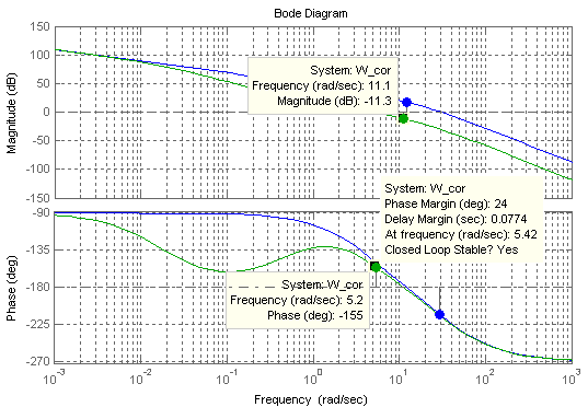 Рисунок 3.1 – Логарифмические частотные характеристики разомкнутой системы ЛЧХ скорректированной системы (рисунок 3.2) говорят о том, что с помощью синтезированного корректирующего устройства удалось добиться приемлемых (по крайней мере близких к требуемым) показателей качества системы. Однако регулятор еще требует «подгонки». Для построения регулятора с отставанием по фазе удобно воспользоваться следующим программным кодом: