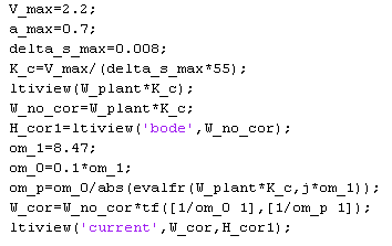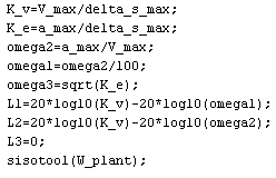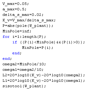 2.3 Определение коэффициента усиления пропорционального регулятора для получения требуемого качества системыВ индивидуальном задании необходимо обеспечить следующие показатели качества управления: - запас устойчивости по амплитуде - запас устойчивости по фазе - максимальная ошибка слежения Т.к. у нас система с астатизмом первого порядка, следовательно, составляющая ошибки по положению равна 0, а составляющая ошибки по скорости определится как Значит, минимальный коэффициент усиления разомкнутой системы должен быть не меньше, чем Для построения запретной зоны удобно воспользоваться программным кодом: