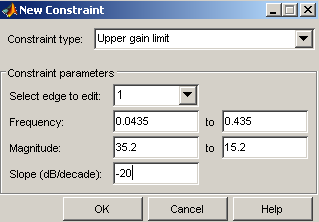 После чего накладываем ограничения на систему (рисунок 2.4), опускаем ЛАЧХ разомкнутой системы (путем уменьшения коэффициента усиления регулятора) практически до запретной зоны, чтобы обеспечить требуемые запасы устойчивости (рисунок 2.5).