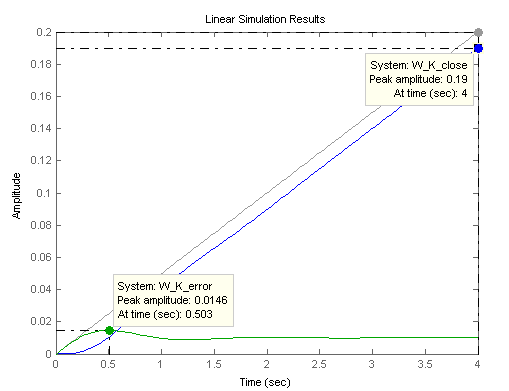 Рисунок 3.6 – Частотные характеристики объекта управления, регулятора и скорректированной системы Экспортируем ПФ регулятора в рабочую область MATLABа и определим ошибку системы при типовых воздействиях (рисунок 3.7):