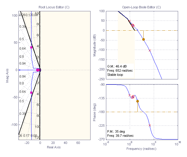Рисунок 2.1 - Распределение нулей и полюсов замкнутой системы и частотные характеристики разомкнутой системы Для наблюдения влияния величины пропорционального регулятора на устойчивость, точность и качество системы автоматического управления создадим M-file со следующим программным кодом: