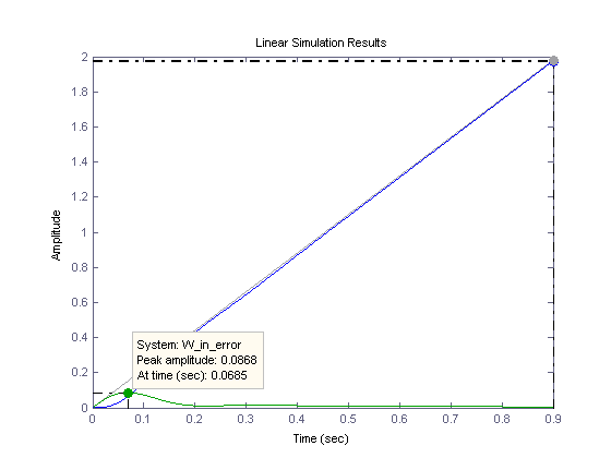 Максимальная динамическая ошибка системы на рисунке 2.7, а) ( Для учета максимального ускорения изменения входного сигнала и ограничения его по скорости построен график, изображенный на рисунке 2.7, в). Из графика видно, что максимальная динамическая ошибка