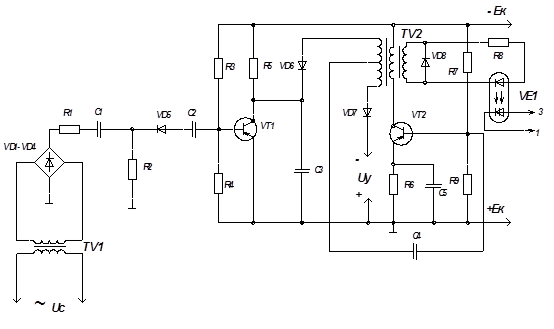 Рисунок 2.3 — Схема блокінг-генератора Максимальний струм в ланцюгу колектора VT2 (струм первинної обмотки Wk) визначимо як Допустиму напругу на колекторі визначимо як: