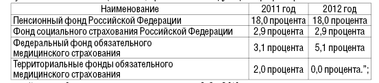 Рис. 1 Тарифы страховых взносов А для лиц 1966г рождения и старше уплаченные работодателями страховые взносы поступали на страховую часть трудовой пенсии. С 1января 2010г базовая часть трудовой пенсии по старости в РФ перешла в страховую часть трудовой пенсии в виде фиксированного базового размера. Это в свою очередь дало возможность сделать ещё одно важное изменение: до сих пор базовая и страховая части пенсии индексировались в отдельности и по разным правилам. С 2010г индексируется вся пенсия целиком в соответствии с ростом заработной платы, но не выше роста доходов Пенсионного фонда в расчете на одного пенсионера. С 1января 2010г работодатели вместо единого социального налога уплачивают страховые взносы в государственные внебюджетные фонды: в Пенсионный фонд РФ, Федеральные фонды социального страхования и обязательного медицинского страхования. В 2010г разбивка 20% взносов в Пенсионный фонд РФ изменилась и составляет: на финансирование страховой части для лиц 1966г рождения и старше уплачивается вся сумма взносов – 20%, а у лиц 1967г рождения и моложе страховая часть составляет 14%, а накопительная – 6%. С 2011 года совокупный платеж составил 34% от фонда оплаты труда, в том числе в ПФ РФ – 26%, ФСС – 2.9%, ФФОМС – 3.1%, ТФОМС – 2.0% Если годовая зарплата сотрудника превышает 415 тысяч рублей, сверх этой суммы страховые взносы уплачиваться не будут. В итоге взносы в ПФ РФ с 2011г составят 26% для лиц 1966г рождения и старше, а для граждан 1967г рождения и моложе 6% на накопительную часть и 20% на страховую. На 2011 - 2012 годы установлен пониженный тариф страховых взносов в ПФР для плательщиков, применяющих упрощенную систему налогообложения и осуществляющих определенные виды деятельности. В Закон о страховых взносах в ПФР, ФСС РФ, ФФОМС и ТФОМС внесено дополнение, предусматривающее возможность применения льготных тарифов организациями и индивидуальными предпринимателями, применяющими упрощенную систему налогообложения, основным видом деятельности которых являются, в частности: производство пищевых продуктов, текстильное и швейное производство, производство машин и оборудования, образование, строительство и т.д. (всего перечень содержит 36 позиций). Для указанных лиц на 2011 год устанавливается пониженный тариф страховых взносов в ПФР – 18% (общий тариф – 26%). В остальные фонды размеры страховых взносов составят: в ФСС РФ - 2,9%, ФФОМС - 3,1%, ТФОМС - 2,0%. В 2012 году размеры тарифов сохранятся. При этом взносы в Фонд обязательного медицинского страхования с 2012 года будут уплачиваться только в ФФОМС[9] . Таблица 1 Тарифы страховых взносов