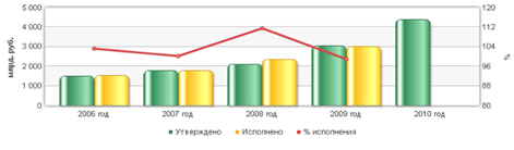 Анализ данных показывает, что в 2006г доходы Пенсионного Фонда превысили утвержденный показатель на 4,54%, а расходы на 3,21%; в 2007г доходы - на 1,71%, а расходы на 0,23%; в 2008г доходы - на 4,16%, а расходы на 11,53%; а в 2009г утвержденные доходы недоисполнены на 1,84%, а расходы на 1,09%. В целом за рассматриваемый период бюджет Пенсионного Фонда был как утвержден, так и исполнен с профицитом. В результате мероприятий по повышению пенсий в 2009 году средний размер трудовой пенсии по старости увеличился на 1,72 тысячи рублей, или на 35% и на конец года составил 6,63 тысячи рублей. В частности, с 1 марта 2009 года установлен размер базовой части трудовой пенсии по старости в сумме 1,95 тысячи рублей с ростом на 8,7% и с 1 декабря - 2,56 тысячи рублей с ростом на 31,4%, одновременно повышены размеры всех других базовых частей трудовых пенсий (по старости, по инвалидности и по случаю потери кормильца). Кроме того, с 1 августа 2009 года проведена индексация страховой части трудовой пенсии на 7,5%, а с 1 апреля 2009 г проведено дополнительное увеличение страховой части трудовой пенсии на 17,5%[11] . Размеры ежемесячных денежных выплат инвалидам, ветеранам и другим категориям граждан были увеличены с 1 апреля 2009 года на 13%. На конец 2009 года общий уровень доходов с учетом установленных ежемесячных денежных выплат и дополнительного ежемесячного материального обеспечения составил в среднем у инвалидов и участников Великой Отечественной войны - 20 тысяч рублей, а у инвалидов, награжденных знаком "Жителю блокадного Ленинграда", - 14 тысяч рублей. Расходы на обеспечение текущей деятельности Фонда составили 61,9миллиарда рублей, или 97,7% к бюджетным назначениям. При этом расходы на содержание органов Фонда за 2009 год составили 59,8 миллиарда рублей (97,9% к бюджетным назначениям) или 2% от общих расходов Фонда (2008 год -2,1%). В целом, индексация пенсий в 2009 году осуществлялась темпами, опережающими рост заработной платы. Среднегодовой размер трудовой пенсии по старости превысил прожиточный минимум пенсионера более чем в 1,3 раза. Средний размер социальной пенсии на конец года достиг величины прожиточного минимума пенсионера в РФ и составил 4,24 тысячи рублей. Фактическое исполнение бюджета фонда за 2009 год по доходам составило 3 миллиарда 222,6 миллиона рублей (101,9% к бюджетным назначениям) и по расходам - 3,008 миллиарда рублей (98,5%). За 2009 год бюджет фонда исполнен с дефицитом в сумме 36,8 миллиарда рублей по текущим обязательствам и профицитом в сумме 250,8 миллиарда рублей по накопительной составляющей бюджета. Межбюджетные трансферты из федерального бюджета, передаваемые фонду в соответствии с законодательством РФ, поступили в полном объеме в сумме 1 триллиона 944,2 миллиарда рублей. В том числе на выплату базовой части трудовой пенсии было направлено 984,4 миллиарда рублей, пенсий по государственному пенсионному обеспечению, доплат к пенсиям, дополнительного материального обеспечения, пособий и других социальных выплат - 560,5 миллиарда рублей, на покрытие дефицита бюджета фонда - 399,3миллиарда рублей. Средства федерального бюджета, передаваемые фонду на осуществление ежемесячных денежных выплат и выплату дополнительного ежемесячного материального обеспечения (инвалидам, ветеранам, Героям Советского Союза, Героям РФ и другим категориям граждан), поступили в сумме 272,74миллиарда рублей (100% к бюджетным назначениям). Доходы бюд