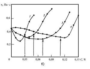 Рисунок 2 - Зависимость эффективности вязкости ВУС из угля двух фракций [крупной (к) размером 250...125 и мелкой (м) размером 60...0 мкм] от содержания в ней дисперсанта (а) и стабилизатора (б). Стрелками указан порог седиментационной стабильности. 1 - содержание угля С = 63 %, соотношение фракций к/м = 60/40; 2 - С = 63, 5 %, к/м = 63, 4/36, 6; 3 - С = 66 %, к/м = 50/50; 4 - С = 63, 5 %, к/м = 66, 7/33, 3