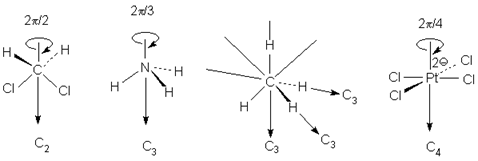 2.1 б. Несобственная ось симметрииПростейшая зеркально поворотная ось S1 эквивалентна перпендикулярной ей плоскости симметрии (S1 є s). Примером является молекула хлорфторметана. Зеркально-поворотные оси более высокого порядка (Sn) можно рассматривать как комбинацию вращения на угол 2p /n с последующим отражением в плоскости, перпендикулярной оси вращения. Так, аллен и изображенный ниже изомер 1,2,3,4-тетраметилциклобутана имеет зеркально-поворотную ось S4: