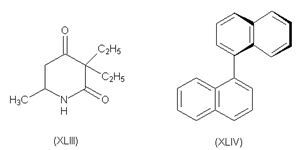 Изомеры, которые можно разделить только благодаря тому, что вращение вокруг простой связи затруднено, называются атропоизомерами. Иногда для предотвращения свободного вращения в бифенилах достаточно трех и даже двух объемистых заместителей в орто-положениях. Так, удалось разделить на энантиомеры бифенил-2,2-дисульфокислоту (XV). В соединении XVI свободное вращение полностью не заторможено, и, хотя его можно получить в оптически активной форме, при растворении в этаноле оно быстро рацемизуется (наполовину за 9 мин. при 250).