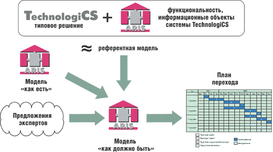 Рис. 5 - Подготовка к процессному внедрению информационной системы Выводы Наибольший эффект от использования информационной системы можно получить, напрямую связывая задачи ее внедрения с применением процессного подхода, то есть выполняя процессное внедрение. Моделирование бизнес-процессов наиболее эффективно с применением специализированных инструментов и проверенных методологий. Чтобы внедрение информационной системы стало принципиально возможным, необходимо еще на этапе принятия решения и подготовки к внедрению осуществить ряд мероприятий, касающихся как анализа ситуации на предприятии, так и анализа самой информационной системы. Для успешного внедрения системы необходим серьезный объем подготовительной работы. Опыт, полученный в ходе подготовки к внедрению системы TechnologiCS на крупном машиностроительном предприятии, показал очевидные преимущества процессного внедрения. Предприятие приступило к процессу внедрения системы, располагая всеми необходимыми знаниями в следующих областях: формализованное описание ситуации, в которой предприятие находилось до внедрения, формализованное описание целевой ситуации, формирующейся в результате внедрения, обоснованный объем финансовых ресурсов, необходимых на приобретение лицензий программного обеспечения, обоснованный объем трудозатрат, необходимый для осуществления всего проекта; сроки проведения этих работ, обоснованный объем финансовых ресурсов, которые необходимо затратить на привлечение внешних консультантов, обоснованный объем внутренних трудовых ресурсов, занятых в рамках проекта. Всё это позволило разработать детальный план внедрения информационной системы и оптимизировать ресурсы, необходимые для перехода предприятия к процессно-ориентированному характеру деятельности. Список используемой литературы 1. Балдин К.В. Информационные системы в экономике: Учебник – 4-е изд. перераб. и доп./ К.В. Балдин.- М.: «Дашков и К 2. Балдин К.В., Уткин В.Б., Информационные системы в экономике: Учебник.- 5-е изд. перераб. и доп./ К.В. Балдин, В.Б. Уткин.- М.: «Дашков и К 3. Барановская Т.П., Лойков В.И., Информационные системы и технологии в экономике/ Т.П. Барановская, В.И. Лойко. - М.: Финансы и статистика, 2005.- 416 с. 4. Информационные системы в экономике / Под ред. Г.А. Титаренко.- М.: ЮНИТИ – ДАНА, 2008. - 463 с. 5. Фрионова Л.Р. Документационное обеспечение маркетинговой деятельности предприятия / Л.Р. Фрионова.- Издательство Пензенского государственного университета, 2003. - 178 с. |