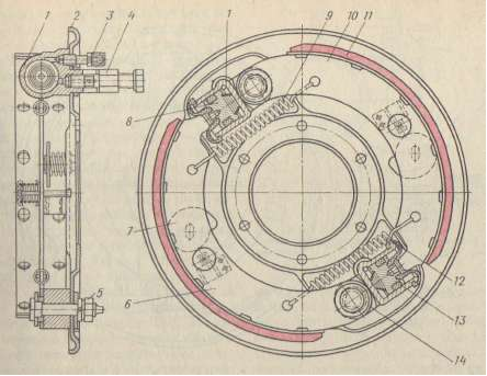 · 1 и 13 — колесные цилиндры; · 2 — опорный диск; · 3 —перепускной клапан; · 4 — штуцер; · 5 и 14 — опорные пальцы; · 6 и 10 — колодки; · 7 — регулировочный эксцентрик; · 8 — поршень; · 9 и 12 — стяжные пружины; · 11 — фрикционная накладка колодки. На рисунке показан барабанный тормоз с равными приводными силами и односторонним расположением опор колодок. Опорный диск 3 закреплен на картере моста. В нижней части опорного диска установлены два пальца 13, на которых закреплены эксцентричные шайбы 12. Положение пальцев фиксируют гайками 14. На эксцентричные шайбы надеты нижние концы колодок 1 и 5. Стяжная пружина 4 прижимает каждую колодку к ее регулировочному эксцентрику 11. Регулировочные эксцентрики закреплены на опорном диске болтами 9, удерживаемыми от произвольного проворачивания предварительно сжатыми пружинами 10. Пружина фиксирует регулировочный эксцентрик в любом положении при повороте его за головку болтов. Таким образом, каждая колодка центрируется относительно тормозного барабана регулировочными эксцентриками и эксцентричными шайбами пальцев. Верхние концы колодок соприкасаются с поршнями цилиндра 2. От боковых смещений колодки удерживаются направляющими скобами 7 с пластинчатыми пружинами. Длина фрикционных накладок, прикрепленных к передним и задним колодкам, неодинакова. Передняя накладка 8 длиннее задней 6. Сделано это для обеспечения одинакового износа накладок, так как передняя колодка работает большее время как первичная и создает больший тормозной момент, чем задняя. Барабан тормоза прикреплен к ступице колеса. Для удобства доступа к колодкам барабан сделан съемным.Тормоз автомобиля УАЗ-452 выполнен по схеме, показанной на рисунке, б. Он имеет две одинаковые тормозные колодки 6 и 10 (рис.), каждая из которых установлена на соответствующем опорном пальце 5 и 14. Колодки стягиваются пружинами 9 и 12, прижимающими их к регулировочным эксцентрикам 7. Концы колодок соприкасаются споршнями 8 колесных цилиндров. Колесные цилиндры 1 и 13 параллельно соединены между собой трубопроводом. Конструкция сервотормоза приведена на рисунке. Опорный диск тормоза укреплен на коробке передач; на нём установлены колодки 2 и 4, разжимной 3 и регулировочный 6 механизмы. Верхние концы колодок прижаты стяжными пружинами 7 и 5 к толкателям 7 разжимного механизма, а нижние — к опорам 12 регулировочного механизма. Усилие стяжных пружин 1 колодки 2 меньше, чем усилие пружин 5 колодки 4. Сухарь 11 регулировочного механизма может перемещаться вместе с опорами 12 колодок на 3 мм относительно винта 15. В расторможенном положении сухарь прижат к корпусу 14сильными пружинами 5 и указанный зазор устанавливается со стороны колодки 2.При нажатии на рычаг 16 усилие от него через тягу 18 передается на рычаг 20. Положение рычага 16 в заторможенном состоянии фиксируется защелкой на зубчатом секторе 17. Короткое плечо рычага 20 давит при этом на разжимном стержень 9, который, вдвигаясь и корпус 8, разводит шариками 10 толкатели 7 обеих колодок. Первой к барабану прижимается колодка 2, имеющая более слабые стяжные пружины. Если торможение происходит при движении автомобиля вперед, то колодка 2 захватывается барабаном и ее нижний конец перемещает колодку 4 до ее соприкосновения с барабаном (перемещение колодки, которое не превышает 3 мм, происходит против хода часовой стрелки). Обе колод